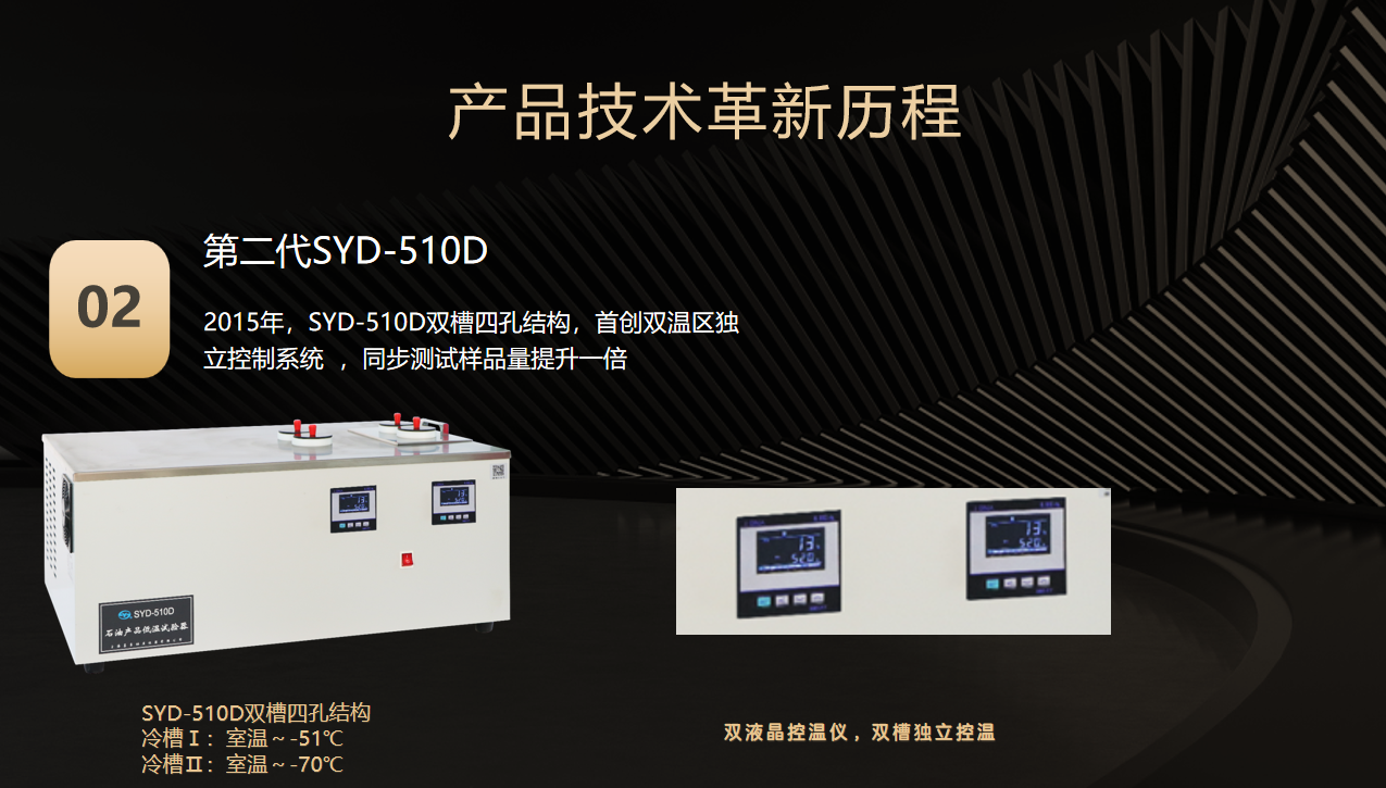 第一代(2010年) SYD-510G、SYD-510-1金屬浴結(jié)構(gòu) 第二代(2015年) SYD-510D雙槽四孔結(jié)構(gòu) ? 首創(chuàng)雙溫區(qū)獨立控制系統(tǒng) ,同步測試樣品量提升一倍 第三代(2020年) SYD-510F1四槽八孔金屬浴結(jié)構(gòu) 冷槽Ⅰ:-17℃~0℃; 冷槽Ⅱ:30℃或-34℃ 冷槽Ⅲ:-51℃~-34℃; 冷槽Ⅳ:30℃或-70℃ 第四代巔峰之作(2025年) SYD-510Z(凝點) SYD-3535Z(傾點、濁點) SYD-0248Z(冷濾點) 三款石油產(chǎn)品低溫流動性設(shè)備同步上市 1.SYD-510Z全自動凝點測定器:整合雙孔金屬浴測試模塊系統(tǒng),適用GB/T 510標(biāo)準(zhǔn),結(jié)合光電技術(shù)實時觀察油樣變化,準(zhǔn)確測定試樣的凝點。 2.SYD-3535Z全自動傾點濁點測定器,整合濁點/傾點雙測試模塊系統(tǒng),一機(jī)覆蓋GB/T 3535、GB/T 6986、ASTM D97、ASTM D2500等4項標(biāo)準(zhǔn)。 3. SYD-0248Z全自動冷濾點測定器,整合冷濾點主機(jī)/抽濾器雙模塊系統(tǒng),一機(jī)覆蓋SH/T0248、ASTM D6371兩項標(biāo)準(zhǔn) 適用標(biāo)準(zhǔn) GB/T 510 核心亮點 1、嵌入式工控機(jī)控制,工業(yè)級嵌入式電腦搭配10.4英寸觸摸屏,支持全中文操作系統(tǒng),操作便捷。 2、高效制冷系統(tǒng),雙壓縮機(jī)復(fù)疊制冷,金屬浴設(shè)計,降溫速度快;高效壓縮機(jī)和優(yōu)化熱管理,降低能耗和噪音。 3、模塊化設(shè)計與擴(kuò)展性,雙浴、雙孔,支持雙浴獨立溫控,可同時檢測兩組數(shù)據(jù);滿足多樣化實驗需求。 4、智能溫控與多功能一體,支持升溫與降溫功能,試樣在一個浴槽內(nèi)完成所有溫度點測定,集成自動樣品傾斜和檢測功能。 5、快速檢測模式,快速法檢測無需升溫等待,直接降溫檢測,結(jié)合光電技術(shù)實時觀察油液變化。 6、智能化數(shù)據(jù)管理,自動計時、判讀結(jié)果、保存數(shù)據(jù)并支持打印,可接入LIMS系統(tǒng)和多機(jī)聯(lián)網(wǎng)。 7、故障自診斷與維護(hù)便利,主界面實時顯示設(shè)備狀態(tài)和故障信息,支持遠(yuǎn)程監(jiān)控和維護(hù)。 GB/T 3535 GB/T 6986 ASTM D97 ASTM D2500 核心亮點 1、先進(jìn)微計算機(jī)控制技術(shù),試驗全過程的自動化完成,放樣后,無需人員隨機(jī)操作,一鍵完成傾點或者濁點檢測。測定集制冷、加熱于一體。 2、采用10寸彩色液晶觸摸屏,中文或者英文(定制)界面顯示,顯示直觀,操作簡單。 3、儀器具有自動降溫、自動傾斜(提升)測試、自動控溫等功能; 4、進(jìn)口復(fù)疊式壓縮機(jī)制冷系統(tǒng),制冷快,極限制冷溫度為-70℃。 5、采用日本進(jìn)口檢測裝置,可檢測到液面微小變化,檢測靈敏度高。 6、先進(jìn)的阱形冷浴箱,具有滯后性小、降溫快,檢測樣品等待時間短。 7,windows操作平臺,多種數(shù)據(jù)傳輸方式,WIFI藍(lán)牙數(shù)據(jù)連接。 8, 測試浴有自動預(yù)熱功能,用戶可以自行設(shè)置是否預(yù)熱、預(yù)熱時間及預(yù)熱溫度; 9,儀器具有浴溫校正、具有強(qiáng)大的數(shù)據(jù)存儲查詢功能。儀器可存儲上千條試驗結(jié)果,可查詢試驗結(jié)果。 適用標(biāo)準(zhǔn) SH/T 0248 ASTM D6371 核心亮點 1、智能觸控操作,采用10英寸彩色觸摸屏,輕觸按鍵即可完成操作,界面友好,使用便捷。 2、高效制冷系統(tǒng),采用全封閉復(fù)疊式高效制冷壓縮機(jī),配合金屬冷阱設(shè)計,無需酒精輔助,制冷速度快且效率高。 3、精準(zhǔn)檢測技術(shù),配備基恩士光纖檢測技術(shù),檢測靈敏度高,確保測量結(jié)果準(zhǔn)確可靠。 4、整機(jī)采用緊湊設(shè)計與一體式結(jié)構(gòu),體積小巧,便于實驗室擺放和操作。 5、穩(wěn)定可靠的控制系統(tǒng),整機(jī)控制采用工業(yè)級PLC控制器,性能穩(wěn)定,運行可靠。 6、數(shù)據(jù)存儲與管理,支持存儲多達(dá)10000組歷史數(shù)據(jù),方便用戶隨時查詢和管理實驗記錄。 7、高效實驗輔助功能,配備微型熱敏打印機(jī),實驗結(jié)束后可自動打印結(jié)果。 8、具備獨創(chuàng)的自動清洗功能,簡化實驗后處理流程,提升實驗效率。 9、嚴(yán)格按照標(biāo)準(zhǔn)方法設(shè)計,儀器遵循標(biāo)準(zhǔn)方法對樣品進(jìn)行冷濾點測定,確保測量結(jié)果準(zhǔn)確、重復(fù)性好、性能穩(wěn)定,且操作簡單易行。 適用標(biāo)準(zhǔn) SH/T 0090 GB/T 2430 核心亮點 1.本儀器由制冷系統(tǒng)、工控上位機(jī)控制系統(tǒng)、嵌入式硬件控制系統(tǒng)、機(jī)電攪拌系統(tǒng)、冷浴試驗觀察系統(tǒng)、框架結(jié)構(gòu)殼體系統(tǒng)等組成。 2.本儀器的冷浴裝置可同時進(jìn)行兩個試管的平行試驗;不銹鋼冷卻浴鑲裝多層內(nèi)空加熱玻璃視窗,保溫性能良好,無露無霜,可視性能優(yōu)良。 3.特制電機(jī)驅(qū)動上下直線運動的試驗攪拌裝置。 4.儀器能夠自動捕捉冰點,根據(jù)冰點的回溫特性,可以在主界面的曲線上直觀地看到變化。 5.本儀器冷浴溫度為預(yù)設(shè)冰點減 28℃,系統(tǒng)自動控制,無需人工干預(yù)。 6.支持通過USB接口或網(wǎng)口連接實驗室LIMS系統(tǒng),實現(xiàn)數(shù)據(jù)共享與管理,包括系統(tǒng)實時升級,確保系統(tǒng)始終處于最新狀態(tài)。 ? 智能檢測識別系統(tǒng);實現(xiàn)樣品裝載→極速降溫→數(shù)據(jù)判定→報告生成全無人值守 ? 金屬浴控溫系統(tǒng);金屬浴結(jié)構(gòu),進(jìn)口復(fù)疊式壓縮機(jī)制冷,制冷效率高,控溫精準(zhǔn),極限制冷溫度達(dá)