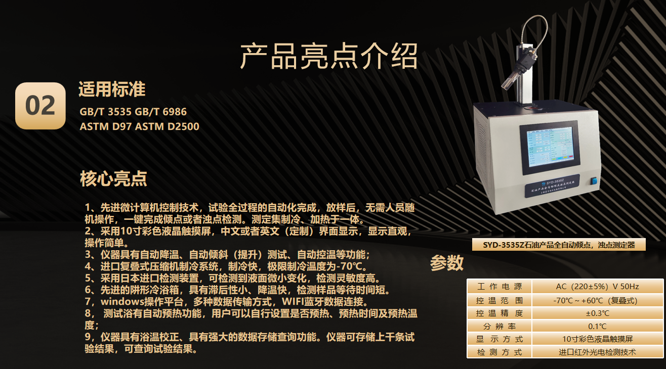 第一代(2010年) SYD-510G、SYD-510-1金屬浴結(jié)構(gòu) 第二代(2015年) SYD-510D雙槽四孔結(jié)構(gòu) ? 首創(chuàng)雙溫區(qū)獨立控制系統(tǒng) ,同步測試樣品量提升一倍 第三代(2020年) SYD-510F1四槽八孔金屬浴結(jié)構(gòu) 冷槽Ⅰ:-17℃~0℃; 冷槽Ⅱ:30℃或-34℃ 冷槽Ⅲ:-51℃~-34℃; 冷槽Ⅳ:30℃或-70℃ 第四代巔峰之作(2025年) SYD-510Z(凝點) SYD-3535Z(傾點、濁點) SYD-0248Z(冷濾點) 三款石油產(chǎn)品低溫流動性設(shè)備同步上市 1.SYD-510Z全自動凝點測定器:整合雙孔金屬浴測試模塊系統(tǒng),適用GB/T 510標(biāo)準(zhǔn),結(jié)合光電技術(shù)實時觀察油樣變化,準(zhǔn)確測定試樣的凝點。 2.SYD-3535Z全自動傾點濁點測定器,整合濁點/傾點雙測試模塊系統(tǒng),一機(jī)覆蓋GB/T 3535、GB/T 6986、ASTM D97、ASTM D2500等4項標(biāo)準(zhǔn)。 3. SYD-0248Z全自動冷濾點測定器,整合冷濾點主機(jī)/抽濾器雙模塊系統(tǒng),一機(jī)覆蓋SH/T0248、ASTM D6371兩項標(biāo)準(zhǔn) 適用標(biāo)準(zhǔn) GB/T 510 核心亮點 1、嵌入式工控機(jī)控制,工業(yè)級嵌入式電腦搭配10.4英寸觸摸屏,支持全中文操作系統(tǒng),操作便捷。 2、高效制冷系統(tǒng),雙壓縮機(jī)復(fù)疊制冷,金屬浴設(shè)計,降溫速度快;高效壓縮機(jī)和優(yōu)化熱管理,降低能耗和噪音。 3、模塊化設(shè)計與擴(kuò)展性,雙浴、雙孔,支持雙浴獨立溫控,可同時檢測兩組數(shù)據(jù);滿足多樣化實驗需求。 4、智能溫控與多功能一體,支持升溫與降溫功能,試樣在一個浴槽內(nèi)完成所有溫度點測定,集成自動樣品傾斜和檢測功能。 5、快速檢測模式,快速法檢測無需升溫等待,直接降溫檢測,結(jié)合光電技術(shù)實時觀察油液變化。 6、智能化數(shù)據(jù)管理,自動計時、判讀結(jié)果、保存數(shù)據(jù)并支持打印,可接入LIMS系統(tǒng)和多機(jī)聯(lián)網(wǎng)。 7、故障自診斷與維護(hù)便利,主界面實時顯示設(shè)備狀態(tài)和故障信息,支持遠(yuǎn)程監(jiān)控和維護(hù)。 GB/T 3535 GB/T 6986 ASTM D97 ASTM D2500 核心亮點 1、先進(jìn)微計算機(jī)控制技術(shù),試驗全過程的自動化完成,放樣后,無需人員隨機(jī)操作,一鍵完成傾點或者濁點檢測。測定集制冷、加熱于一體。 2、采用10寸彩色液晶觸摸屏,中文或者英文(定制)界面顯示,顯示直觀,操作簡單。 3、儀器具有自動降溫、自動傾斜(提升)測試、自動控溫等功能; 4、進(jìn)口復(fù)疊式壓縮機(jī)制冷系統(tǒng),制冷快,極限制冷溫度為-70℃。 5、采用日本進(jìn)口檢測裝置,可檢測到液面微小變化,檢測靈敏度高。 6、先進(jìn)的阱形冷浴箱,具有滯后性小、降溫快,檢測樣品等待時間短。 7,windows操作平臺,多種數(shù)據(jù)傳輸方式,WIFI藍(lán)牙數(shù)據(jù)連接。 8, 測試浴有自動預(yù)熱功能,用戶可以自行設(shè)置是否預(yù)熱、預(yù)熱時間及預(yù)熱溫度; 9,儀器具有浴溫校正、具有強(qiáng)大的數(shù)據(jù)存儲查詢功能。儀器可存儲上千條試驗結(jié)果,可查詢試驗結(jié)果。 適用標(biāo)準(zhǔn) SH/T 0248 ASTM D6371 核心亮點 1、智能觸控操作,采用10英寸彩色觸摸屏,輕觸按鍵即可完成操作,界面友好,使用便捷。 2、高效制冷系統(tǒng),采用全封閉復(fù)疊式高效制冷壓縮機(jī),配合金屬冷阱設(shè)計,無需酒精輔助,制冷速度快且效率高。 3、精準(zhǔn)檢測技術(shù),配備基恩士光纖檢測技術(shù),檢測靈敏度高,確保測量結(jié)果準(zhǔn)確可靠。 4、整機(jī)采用緊湊設(shè)計與一體式結(jié)構(gòu),體積小巧,便于實驗室擺放和操作。 5、穩(wěn)定可靠的控制系統(tǒng),整機(jī)控制采用工業(yè)級PLC控制器,性能穩(wěn)定,運行可靠。 6、數(shù)據(jù)存儲與管理,支持存儲多達(dá)10000組歷史數(shù)據(jù),方便用戶隨時查詢和管理實驗記錄。 7、高效實驗輔助功能,配備微型熱敏打印機(jī),實驗結(jié)束后可自動打印結(jié)果。 8、具備獨創(chuàng)的自動清洗功能,簡化實驗后處理流程,提升實驗效率。 9、嚴(yán)格按照標(biāo)準(zhǔn)方法設(shè)計,儀器遵循標(biāo)準(zhǔn)方法對樣品進(jìn)行冷濾點測定,確保測量結(jié)果準(zhǔn)確、重復(fù)性好、性能穩(wěn)定,且操作簡單易行。 適用標(biāo)準(zhǔn) SH/T 0090 GB/T 2430 核心亮點 1.本儀器由制冷系統(tǒng)、工控上位機(jī)控制系統(tǒng)、嵌入式硬件控制系統(tǒng)、機(jī)電攪拌系統(tǒng)、冷浴試驗觀察系統(tǒng)、框架結(jié)構(gòu)殼體系統(tǒng)等組成。 2.本儀器的冷浴裝置可同時進(jìn)行兩個試管的平行試驗;不銹鋼冷卻浴鑲裝多層內(nèi)空加熱玻璃視窗,保溫性能良好,無露無霜,可視性能優(yōu)良。 3.特制電機(jī)驅(qū)動上下直線運動的試驗攪拌裝置。 4.儀器能夠自動捕捉冰點,根據(jù)冰點的回溫特性,可以在主界面的曲線上直觀地看到變化。 5.本儀器冷浴溫度為預(yù)設(shè)冰點減 28℃,系統(tǒng)自動控制,無需人工干預(yù)。 6.支持通過USB接口或網(wǎng)口連接實驗室LIMS系統(tǒng),實現(xiàn)數(shù)據(jù)共享與管理,包括系統(tǒng)實時升級,確保系統(tǒng)始終處于最新狀態(tài)。 ? 智能檢測識別系統(tǒng);實現(xiàn)樣品裝載→極速降溫→數(shù)據(jù)判定→報告生成全無人值守 ? 金屬浴控溫系統(tǒng);金屬浴結(jié)構(gòu),進(jìn)口復(fù)疊式壓縮機(jī)制冷,制冷效率高,控溫精準(zhǔn),極限制冷溫度達(dá)